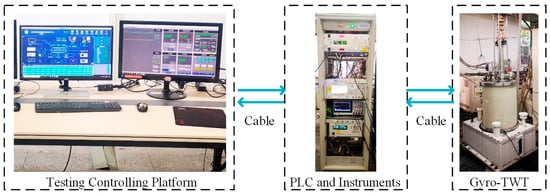 To validate the feasibility of the OEM technology in the context of the W-band gyro-TWT, a test platform is established, and the OEM is integrated into the system, as shown in Figure 13. The system consists of the testing controlling platform, PLC, testing instruments, and gyro-TWT. The controlling platform sends the test order to the instruments through PLC. Then, the electric parameters and input signal are applied to the gyro-TWT. The OEM is deployed on the testing controlling platform.
