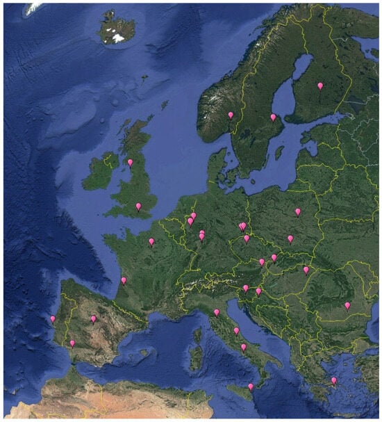 The map of European small-scale facilities reviewed in this paper (courtesy of Google Earth). The corresponding facilities are depicted with the pink placemark.