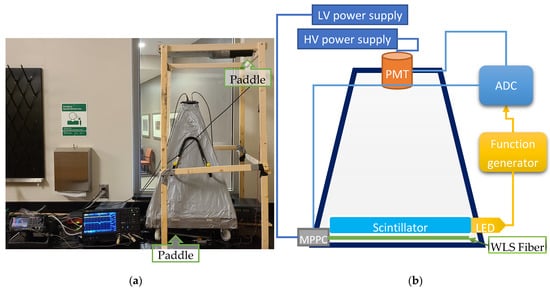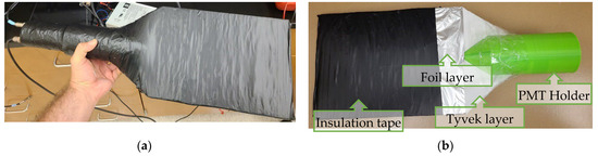 To make sure that the particle passes through the detector, a double-coincidence scheme is used. For that, two simple detectors are needed that are placed above and under the module under testing. The most common simple detectors are called paddles, which are just a flat piece of the scintillator coupled with the PMT. These scintillator paddles form the hodoscope for the cosmic muon coincidence scheme for the prototype calibration. Each paddle is manufactured from a 2.4 cm-thick scintillator, with the square part of the paddle being about 25 cm × 35 cm. The PMT holder that attaches to the case is 3D-printed. The scintillator on the bottom side has a layer of Tyvek for higher light yield. Additionally, aluminum foil, insulation tape, and duct tape were added for both light insulation and structural support. Figure 2a shows the completed paddle, and Figure 2b shows all the layers exposed before completion. The same model PMTs are used for the detector modules. These two paddles were constructed for use in a double coincidence scheme to be used for the detector system’s individual module calibration. The paddles will be placed above and under each module for this process, as shown in Figure 1a. The paddles are smaller than the module size, this way, different parts of the module can be calibrated as the detector response uniformity can be estimated.