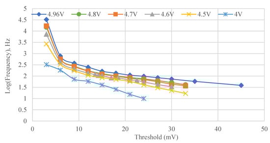 For this test, the detector in question is connected to the signal counter (or scaler) via the discriminator. We have used the Rigol MS5A231000594 oscilloscope as it has a counter with the variable threshold already built in. The count values are recorded at different bias voltages and threshold values and then plotted. Figure 3 is a sample plot of the log of the average number of counts per second (i.e., average frequency) vs. the threshold value for different biases for the detector prototype module shown as an example. As the threshold is increased for the same bias voltage, first the noise is reduced, then the actual CR signal counts start to be cut by further threshold increases. The region where the fast-decreasing noise counts transition into the CR counts can appear as either a short horizontal line or form a rather large plateau. The threshold is typically chosen at the beginning of the plateau (i.e., the right side of it) for a given bias so as to keep the CR signal as some noise can be tolerated as described next.