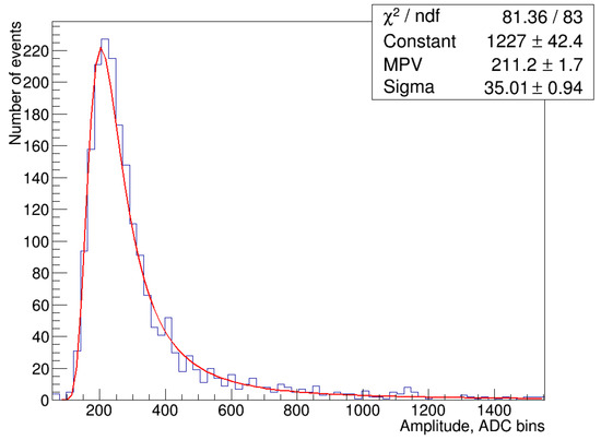 The amplitude of the detector response to MIP. Red line is a fit using Landau curve.
