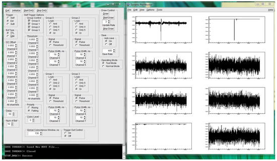 The rest of the interface deals with setting the parameters for the self-triggering option. One can set the threshold for each channel and set the triggering of the channel group (channels 0–1, 2–3, 4–5 and 6–7 are in four groups). Pulse width sets the coincidence window in Equation (1)—how many ns will the ADC wait after the threshold is reached for the second pulse before giving up. The number of buffers controls the number of points in each event—from 5111 to the higher number of buffers (the actual number is 2 to the power of 10), and the number of points in each event doubles with the reduction in the number of buffers—i.e., 10222 for , etc. The coincidence level sets the global coincidence between channel groups—how many groups must report a signal before the global trigger is issued.