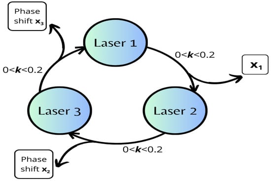 with as the coupling coefficient, having , , , and . The lasers are coupled in a diffusive form which means that for laser 1 We add a term , as Equation (9) mentions, which means that laser 1 is coupled with laser 2, and “k” is the coupling strength. Similarly, the coupling between laser 2 with laser 3, and laser 3 with laser 1 is implemented. Also, We must consider that a change in the parameter k directly affects the pump power, then the behavior of the system could change after a threshold value for k.