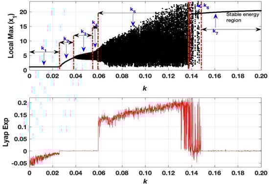 Due to the symmetry of the ring configuration, the behavior of each EDFL follows the same dynamics. Therefore, we show in Figure 3 (top) the dynamic evolution of one of the lasers in the ring (), and Figure 3 (bottom) shows , the maximum Lyapunov exponent (MLE), as a function of the coupling k between the lasers. The bifurcation diagram shows the Landau path leading from a stable fixed point to a chaotic behavior through a quasi-periodicity regime characterized by different Hopf bifurcations [,]. This scenario was identified by Newhouse, Ruelle, and Takens (known as the NRT scenario []), who found that a chaotic attractor resembling a 3D torus forms shortly after the third Hopf bifurcation. Our model, which is described by Equations (7) and (8), shows a similar hyperchaotic behavior when the coupling strength k is varied.