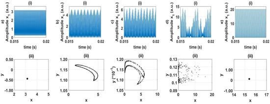 (i) Time series and (ii) the corresponding Poincaré sections at (a) , (b) , (c) , (d) , and (e) .