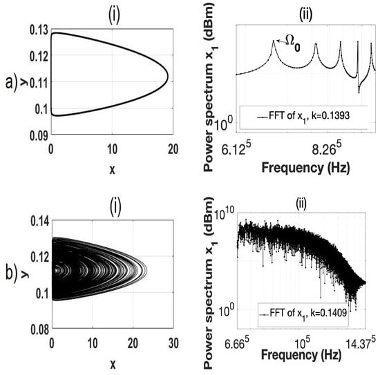 Bistable region for containing (a) a stable limit oscillation and (b) chaotic dynamics for (i) the phase spaces of the behavior and (ii) the frequency-power spectra.