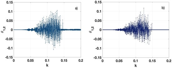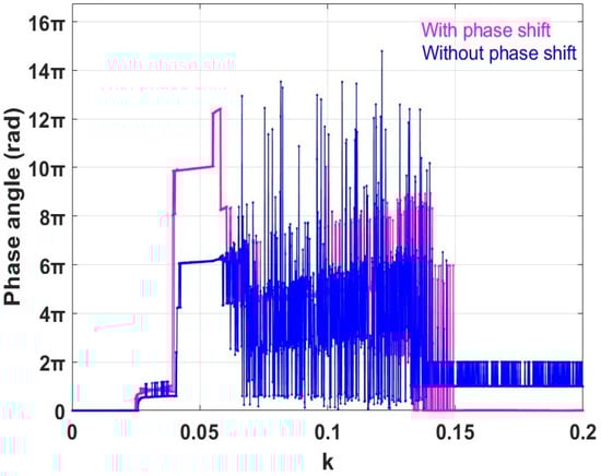 Figure 11 shows the phase synchronization scenarios resulting from Equations (12) and (11). Here we show how the time-averaged phase synchronization depends on the coupling strength k. We can also observe how the phase difference changes when applying phase correction calculations. Figure 11a shows the phase relationship between the signals and without any phase modification. In contrast, Figure 11b shows the phase behavior after applying a cross-correlation function to to align it with the signal .