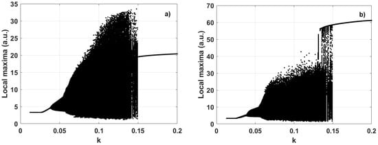In the latter case, the phase difference approaches zero beyond . This shows that the systems are phase-coupled at optical transmittance values exceeding this threshold. Consequently, their signals can be summed, resulting in a significant increase in optical power. Figure 12a shows the bifurcation diagram of the superposition of the three lasers connected in the ring. For , the result of each coupled laser energy has a value of 20 (a.u.), which represents the individual energy of each laser and is twenty times higher than the initial value at the low coupling. However, when the phase shift was applied, there was a larger increase in optical energy to 60 (a.u.) as shown in Figure 12b.