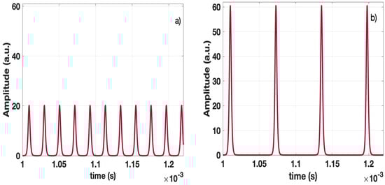 The corresponding time series of the total energy that can be obtained by adding the individual laser energy for , taking into account the case without phase shift and the case with phase shift, can be seen in Figure 13. The differences between them are the oscillation frequency and the pulse intensity. In both cases, the increase in optical energy compared to the initial energy is evident and is achieved by increasing the coupling between the oscillators.