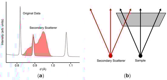 Figure 2 provides a simplified but illustrative example of the type of unwanted events this algorithm is intended to help identify. It shows a configuration of the sample (primary scatterer, black) and secondary scatterer (red) assuming a top view of the detector in addition to the resulting diffractogram. The expected d-based diffractogram (black) can be seen alongside the red-shaded secondary scatterer intensity, which is typically broadened due to mismatched instrumental conditions (detector design concepts detailed in [9,18]).