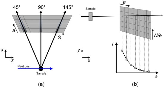 (a) Top view of the detector (a vs. S) with different exemplary trajectories of equivalently scattered neutrons at different 2θ values (for one arbitrary wavelength). (b) Side view (N/e vs. a) showing a single trajectory’s flight path and how this translates into a depth–intensity expectation (I vs. a). Note that in this simplified picture, in some of the voxels the trajectory corresponding to the black arrow causes intensity, although no interaction with the boron conversion layer (thin lines) occurs, simply because the single arrow does not reflect the angular uncertainty.