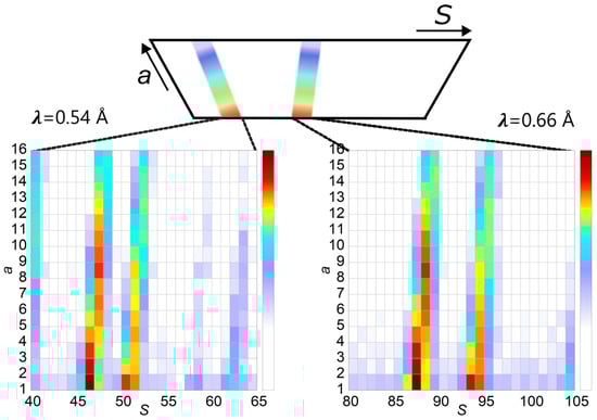 The color-scaled intensity plotted against the instrument’s voxel identifiers a and S illustrates how reflections “move” along the detector with λ. The two plots show the same reflections around d = 0.47 Å ± 0.05 Å but for two different wavelengths. In addition, the detector design implies that a reflection shift toward higher S-values can be observed at higher a-values.