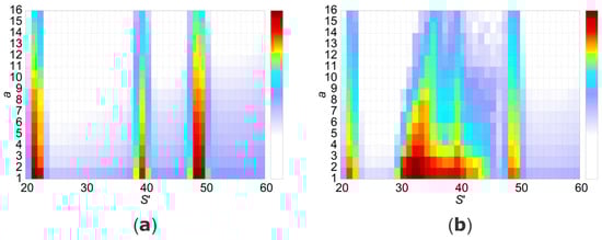 The color-scaled intensity plot against the a and S′ reveals the presence (a) of three straight vertical reflections with a width of two to four stripes but (b) one additional, extensively broadened reflection. The three straight reflections from the primary scatterer exhibit a distinct and consistent decline in intensity. In contrast, the broad contribution from the secondary scatterer is notable with clearly different nature including a markedly different intensity reduction with depth for each S′.