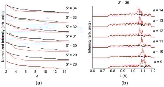 Intensity plots showing the original unedited diffraction data (black) and the diffraction data with an added secondary scatterer (red). (a) Normalized intensity plotted against the depth identifier a for a select number of S′ values showing an S′ value without secondary intensity (S′ = 28) and S′ values with secondary intensity (S′ = 28–34). (b) Intensity plotted against the wavelength for one single S′ = 39.