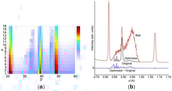 Color-scaled intensity plots after removing bad event data. (a) Intensity vs. a and S′ (see Figure 6 for comparison). (b) Intensity vs. d diffractogram with the optimized intensity in black, the original data with the secondary scatterer intensity in red and the leftover bad intensity in blue.