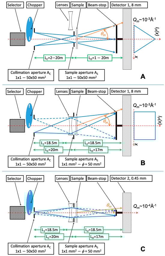Schematic view of the three working modes offered for routine use of the KWS-2 SANS diffractometer of JCNS at MLZ, Germany: (A) the conventional pinhole mode; (B) the enhanced intensity focusing mode; (C) the high-resolution (low Q) focusing mode. Reprinted (adapted) with permission from [2].