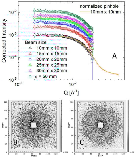 Figure 2 shows the scattering patterns of spherical polystyrene particles with a radius of Rsph = 150 Å in D2O-H2O solution, measured at KWS-2 [2] in pinhole mode with the sample aperture AS size of 10 mm × 10 mm (Figure 1A) and in the enhanced intensity mode with lenses and different sample aperture size AS—ranging between 10 mm × 10 mm and 30 mm × 30 mm in square and a diameter of 50 mm in round shapes (Figure 1B). Using 26 lenses with neutrons of wavelength λ = 7 Å, an intensity gain on the sample of up to about twelve times is achieved by increasing the beam size on the sample (Figure 2A), while the beam size (the Qm resolution) on the detector remains constant, as shown in Figure 2B,C. The two-dimensional (2D) scattering patterns (Figure 2B,C) are corrected for the contribution of the empty cuvette and normalized to the monitor of the incident monochromatic beam, while the one-dimensional (1D) scattering profiles (Figure 2A) are obtained by radial averaging of the 2D scattering patterns. The intensity enhancement factor can be easily estimated by comparing the scattering levels of the plateau observed at low Q in all scattering patterns. This factor includes the transmission of the ensemble of 27 lenses kept cold at 77 K, i.e., Trlenses = 61% when the entire lens area is used, which was estimated with the transmission monitor placed in the middle of the beam-stop [2,3]. It should be noted that the transmission of the entire set of lenses in the cold state is about twice as high as the transmission of lenses used at RT [54], which is due to the suppression of scattering from phonons in the lens material.