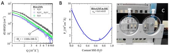 (A) Contrast variation SANS experiments using neutron lenses in order to use larger samples of 5 cm diameter. (B) P3 amplitude (see text) versus SSE-D2O. The minimum is found at φM = 0.61, determining the matching point. Reprinted with permission from [56]. Copyright (2014) American Chemical Society. (C) The large-size (5.4 cm diameter, 1 mm beam path) quartz cuvettes used with the enhanced intensity mode with lenses at KWS-2.