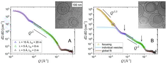 The myelin basic protein (MBP) and its interaction with the lipids of the myelin sheath play an important role in the pathology of multiple sclerosis (MS). The myelin sheath is a multilamellar membrane consisting of lipids and proteins that coats the axons of neurons. It plays an important role in neuronal signal conduction, as it is the insulating layer that enables rapid signal transport over long distances in the white matter of the brain by reducing conduction losses. Various diseases and conditions, such as MS, damage or destroy myelin. SANS/USANS and SAXS studies on the association of MBP with lipid membranes can shed light on the molecular origin of structure formation and structural instabilities in biosynthetic model lipid membranes with native and disease-like lipid composition and their mechanism of interaction with MBP [59,61]. Figure 4A,B show scattering patterns recorded at room temperature over the entire Q-range available at KWS-2, combining the pinhole and focusing modes of a sample consisting of a mixture of lipid molecules forming unilamellar vesicles (ULV) in a D2O buffer solution (Figure 4A). These exhibit adhesion (docking) effects when MBP is added to the solution (Figure 4B), resulting in vesicle assemblies and multilamellar domains, as is nicely shown in the cryo-TEM image in Figure 4B [39]. Mixtures of lipid molecules mimicking native healthy and diseased myelin membranes were studied, with a selected case of the healthy composition study reported here. Details of the sample composition and preparation protocols can be found in [58]. Small-angle neutron scattering (SANS) was measured using the SANS diffractometer KWS-2 with conventional pinhole and high-resolution (low Q) focusing lens modes. The experimental conditions are described in detail in [39], while in Figure 4A,B, data measured under different λ, LD conditions or instrument operating mode are represented by different colored symbols. ULVs are formed by the mixture of lipid molecules in solution (Figure 4A), whereby no traces of vesicle aggregation were observed even at higher lipid concentrations in the solution [59]. From the interpretation of the SANS results with the vesicle form factor (red curve in Figure 4A), the vesicle size Rves ≈ 550 Å and the thickness of the bilayer dves ≈ 35 Å were obtained. In contrast to the case of lipids alone in the solution, with MBP (Figure 4B), the Guinier regime (the leveling off of the scattering intensity towards low Q) was observed at a Q about one order of magnitude lower compared to the protein-free solution case (Figure 4A). The addition of MBP to the lipid solution, therefore, results in much larger morphologies. Additional scattering features at medium and high Q were also observed, such as the broad maxima indicated by the vertical arrows in Figure 4B. The scattering features observed in Figure 4B were better understood by analyzing the Cro-TEM micrographs of the same solution. The large-scale aggregates represent the vesicle assemblies mediated by the MBP; the hump at medium Q refers to the form factor detail of individual and assembled vesicles that can still be easily recognized in the micrographs; while the broad maximum at high Q is due to correlation effects caused by the local multilamellar character of the morphology, where two vesicles come into contact with each other. The scattering data were well described (red curve in Figure 4B) by a combination of single and clustering ULVs (blue line), as described in [62], combined with a Beaucage form factor [63] of the large-scale aggregates. Details of the analysis are described in [39].