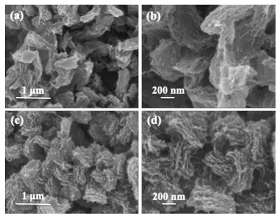 SEM micrographs of PEEK aerogels dried using supercritical fluid extraction. Aerogels were prepared from 15 wt % PEEK in DCA (a,b) or 4CP (c,d). Reprinted with permission from [58]. Copyright (2019) American Chemical Society.
