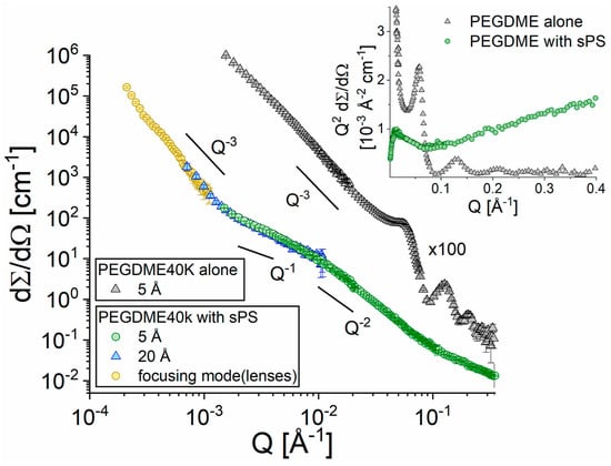 Scattering pattern in log–log plot from the morphology of PEGDME40K at 10 °C formed as a result of the co-gelation process with the sPS in THF, measured over a wide Q-range at matching conditions of sPS with THF (green/blue/yellow symbols). The gelation result of PEGDME40K in THF is shown in parallel in black symbols. The Kratky representation of the data is shown in the inset. The power law behavior of the scattering intensity in different Q-domains is given as explained in the text. Reprinted with permission from [57]. Copyright (2024) Elsevier.