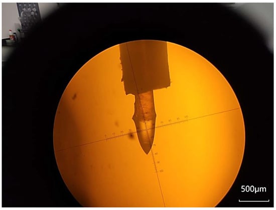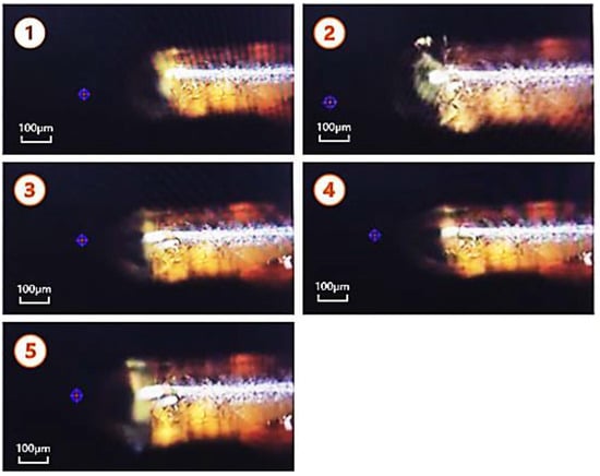 The electrospinning parameters were examined using an optical microscope with 10× magnification. A stable Taylor cone was observed, shown in Figure 1, at 0 °C and a vacuum of 10−4 mbar. At this point, the voltage was set to 3800 V, the flow rate was 0.1 µL/min, and the electrode distance was 4 mm. The spinning solution comprised a lysozyme crystallization pool solution, 4 M sodium chloride, 0.1 M citric acid, and 0.1 M sodium acetate. To increase the viscosity of the solution and enhance its stability under low pressure, 20% glycerol was incorporated into the spinning solution. A 20,000-frame high-speed camera was employed to capture the rapid passage of the liquid surface through the optical path following the formation of a liquid droplet from the Taylor cone, shown in Figure 2.