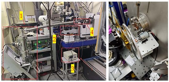 In the left illustration, the components are designated as follows: 1 represents the vacuum pump, 2 denotes the syringe pump, 3 indicates the high voltage power supply, and 4 refers to the primary structure of the vacuum chamber. The right illustration depicts the chopper utilized for modulating the pulse.