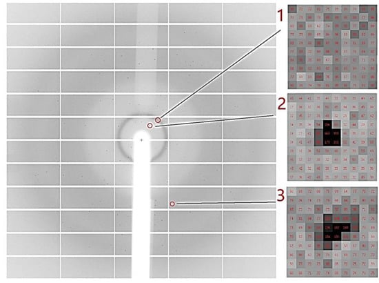 The diffraction pattern corresponding to the successfully indexed data was identified. Despite the software yielding indexing results and determining the diffraction pattern as being indicative of protein crystals, the majority of diffraction points in these maps exhibited very low intensities (ranging from 60 to 150), resulting in a relatively poor signal-to-noise ratio (less than 3), shown in Figure 5. The primary factor contributing to this outcome is the inadequate exposure time of the crystal, which led to inaccurate fitting results from the software during the indexing process, ultimately resulting in the failure to obtain correct unit cell parameters. Currently, the principal challenges affecting data quality in experiments conducted at the synchrotron radiation beamlines include short exposure times and insufficient luminous flux available at the station. Results from offline experiments indicate that the effective exposure time for the actual crystal is approximately 0.4 ms, which does not meet the exposure requirements given the luminous flux of conventional synchrotron radiation beamlines. To obtain diffraction data of sufficient quality using this method at synchrotron beamlines, further enhancement of X-ray flux is required, which depends on future technological breakthroughs in synchrotron radiation facilities.