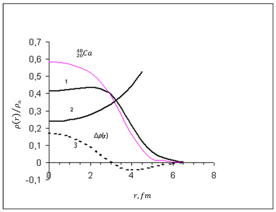 Figure 1. Curve 1—radial dependence of nucleon density for C 20 48 a ; Curve 2—ratio of proton to neutron densities; and Curve 3—the difference in the distributions of neutron and proton densities, i.e., Δ ρ ( r ) = ρ n ( r ) ρ p ( r ) . The experimental curve is shown in pink [20].