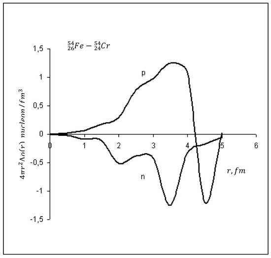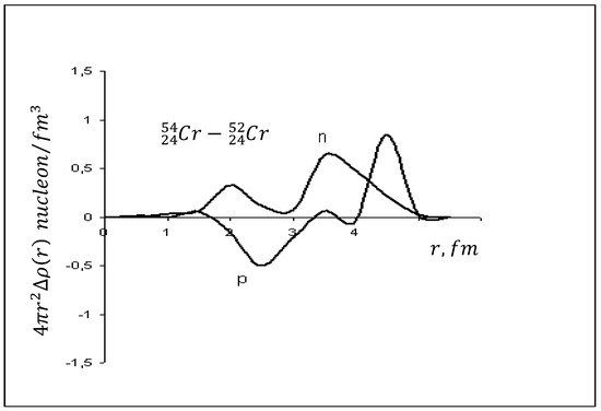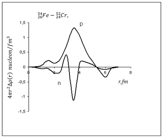 Finally, as shown in Figure 4, during the transition in the F 26 54 e C 24 54 r isobars, the added protons occupy places in the unfilled subshell 1 f 7 2 and, at the same time, due to the replaced neutrons located in subshell 1 f 7 2 in the chromium core, the neutron density at the periphery decreases sharply.