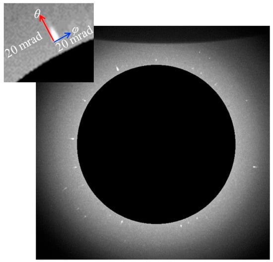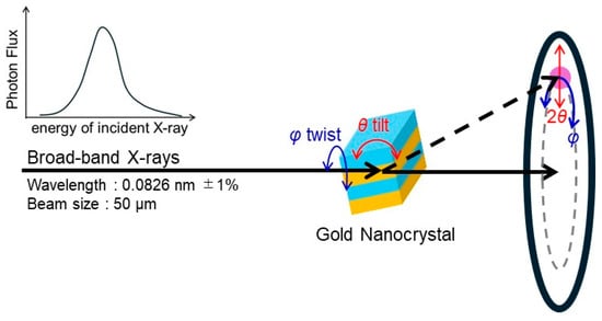 The DXT method is a technique to visualize the rotational motion of individual crystalline nanoparticles by monitoring the displacement of diffraction spots from moving crystalline nanoparticles, such as gold nanocrystals, using time-resolved X-ray diffraction measurements with broadband X-rays (a white or pink beam) [19,20,21,22,23,24,25]. Figure 1 shows a schematic representation of DXT for crystalline nanoparticles by using broad-band X-rays. The coordinates of diffraction spots on a two-dimensional detector from crystalline nanoparticles using broadband X-rays are described by the azimuthal angle (φ) and diffraction angle (2θ). The φ is determined by the rotation angle of the crystalline plane of the crystalline nanoparticle with the direction of the incident X-ray. Therefore, the φ-component of the displacement of the diffraction spot corresponds to the rotational motion around the axis parallel to the direction of the incident X-ray. The θ, on the other hand, follows Bragg’s law. In the case of broadband X-rays, different angles between the incident X-ray and the diffracting plane result in different wavelengths that satisfy Bragg’s law, so the position of the spot changes according to the following equation.