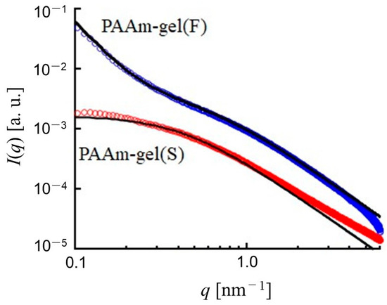 SAXS profiles of PAAm gel(F) and PAAm gel(S). Solid lines are calculated by Equation (2) with ξ = 2.7 nm for PAAm gel(S) and Equation (3) with Ξ > 15 nm and ξ = 1.6 nm.