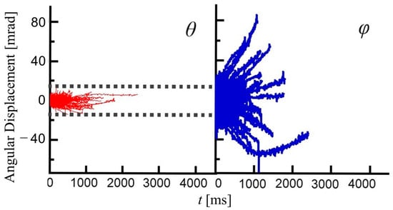 Figure 4 shows a two-dimensional diffraction image of the GNPs encapsulated in PAAm gel(S). This image is obtained by integrating a series of 450 diffraction images acquired through time-resolved X-ray diffraction measurements at an interval of 10 ms. The dark region at the innermost part is the area where the X-ray beam is masked. Just outside the dark region, many Laue diffraction spots attributed to the Au (111) plane are observed on a concentric circle. A similar result is obtained for PAAm gel(F). This means GNPs are individually dispersed in PAAm gels. It can be seen that the diffraction spots are not points but have widths. The width of these diffraction spots is due to the displacement of the diffraction spots caused by the rotational motion of GNPs in the PAAm gel(S). The inset in Figure 4 is an enlarged view of a typical diffraction spot. The spot appears to be elongated in the θ direction. As can be seen from Figure 1, the rotational motion in the θ direction appears to be the displacement of the diffraction angle corresponding to twice of rotational angle of the GNPs. Accordingly, the spatial resolution is 0.19 mrad/pix in the θ direction, which is much better than that in the φ direction (1.1 mrad/pix). The trajectories of the diffraction spots of Au (111) planes of individual GNPs are tracked to analyze the rotational motion of GNPs in PAAm gels. Figure 5 shows the rotational angle of GNPs in the φ and θ directions obtained from the displacements of diffraction spots from Au (111) planes in PAAm gel(S) as time progresses. As can be seen at a glance, there are large angular displacements of diffraction spots in the φ direction, whereas those to the θ direction are quite small. The angular displacements in the θ direction correspond to the rotational motion of GNPs around the rotation axis perpendicular to the direction of the incident X-ray. In this case, the displacement of the diffraction spot indicates the change in the X-ray wavelength that satisfies Bragg’s condition. Because the energy distribution of X-rays used in this study is ±1% for 15.3 keV, the displacement of the rotational angle of GNPs in the θ direction is limited within ±30 mrad. On the other hand, since the angular displacements of GNPs in the φ direction do not change the Bragg conditions, the rotational displacement of GNPs in the φ direction is allowed up to 2π rad. Therefore, although the angular resolution of the θ direction is much better than that in the φ direction, the rotational displacements in the φ direction are observed over a wider angular range than those in the θ direction. Thus, the displacements of diffraction spots from the Au (111) planes of GNPs, which are in an environment where the rotational motion of GNP in the θ direction is restricted and that in the φ direction is allowed, are mainly detected. This indicates that the displacements of the diffraction spots from GNPs in the φ direction more sensitively capture the rotational motion of the GNPs. Thus, in this study, we discuss the distribution of the rotational motion of the GNPs based on the displacements of diffraction spots in the φ direction.