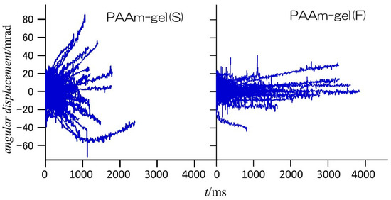Figure 6 shows the angular displacements of the diffraction spots from the Au (111) planes of GNPs encapsulated in PAAm gel(S) and PAAm gel(F) in the φ direction. In the PAAm gel(S), which is the homogeneous gel, the range of angular displacement is wider than ±60 mrad, and most diffraction spots disappear within approximately 2000 ms after they appear. On the other hand, in the heterogeneous PAAm gel(F), the range of angular displacement is within ±40 mrad, and there are diffraction spots that are observed for more than 3000 ms. This indicates that PAAm gel(S) contains more GNPs with high mobility, while PAAm gel(F) contains more GNPs with restricted rotational motion. Since most of the observed diffraction spots were observed for up to 200 ms after they appeared, the time dependences of the mean square angular displacement (MSD) of GNPs in the PAAm gels within 200 ms are examined.