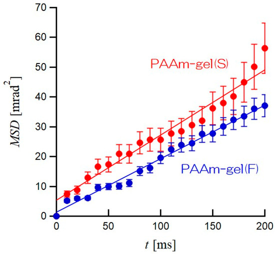 Figure 7 shows plots of MSDs as the average of the MSDs of all GNPs in the PAAm gel(S) and PAAm gel(F) as functions of elapsed time t. In both PAAm gel(S) and PAAm gel(F), it can be seen that the MSDs are proportional to t. The solid lines in Figure 7 are straight lines obtained by the least-squares approximation excluding t = 0. The slope of the MSD vs. t plot for PAAm gel(S) is slightly larger than that of PAAm gel(F). In other words, the GNPs encapsulated in PAAm gel(S) are more active in terms of rotational motion than those in PAAm gel(F). The time dependence of MSD is related to the rotational diffusion coefficient of the GNPs in PAAm gels by the following equation: