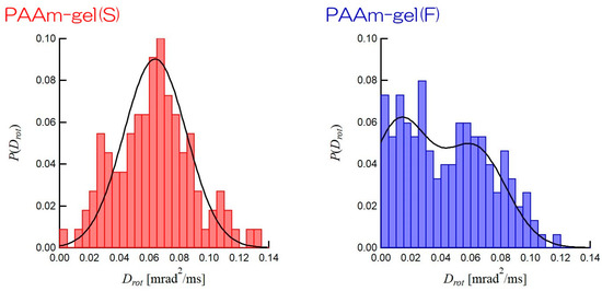 where Drot is the rotational diffusion coefficient of GNPs, t is the elapsed time after the diffraction spot appears, and σ is the average error, which is a random error when determining the position of the GNPs and is generally discarded [29]. For PAAm gel(S), the straight line was obtained by using 0.218 mrad2/ms as the slope containing the standard deviation of ±0.011 and 5.34 as 2σ2, with a correlation factor r2 of 0.958. On the other hand, for PAAm gel(F), the straight line was obtained by using 0.180 mrad2/ms as the slope containing the standard deviation of ±0.0047 and 5.63 as 2σ2, with a correlation factor r2 of 0.988. Therefore, for both PAAm gel(S) and PAAm gel(F), good linear approximations were obtained. The averaged Drots of GNPs obtained from the straight lines in Figure 7 are 0.064 mrad2/ms for PAAm gel(S) and 0.048 mrad2/ms for PAAm gel(F). The Drot of PAAm gel(S) is 1.3 times higher than that of PAAm gel(F), even though the equilibrium swelling factors are the same. The heterogeneous PAAm gel(F) is constructed by both high- and low-network-density regions. The rotational motions of GNPs with a 200 nm diameter incorporated in the low-network-density region are restricted, even though the low-network-density region can swell with water. Therefore, the difference in the heterogeneity of the network density in PAAm gels with the same swelling ratio should cause slight differences in the average Drot for all GNPs in PAAm gels. In order to discuss the heterogeneity of the network in PAAm gels, it is necessary to obtain the Drot for each GNP and to determine their distribution. Thus, the Drot is calculated for each diffraction spot based on the relationship between MSD and time, and the distribution was examined.