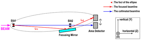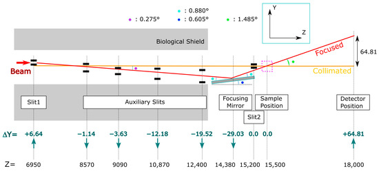 Table 2 displays beam sizes at the device positions. They were restricted by slit apertures and the acceptance of the focusing mirror so that they both became 1 × 2 mm2 at the detector position. The vertical aperture of Slit 1 for the focusing beam was determined by the magnification at the mirror center so that the beam was focused on a spot of 1 mm in vertical width at the detector in the designed geometry. In contrast, the acceptance of the mirror is obtained from the mirror length and the incident angle. For the optimum collimation, the vertical slit apertures were calculated using Equations (A5) and (A6) in Appendix A. The difference in the vertical beam restrictions between the two beamlines directly affects the intensity gain due to the focusing. On the other hand, horizontal beam restrictions were 2 mm at Slit 1 and Slit 2 for both beamlines.
