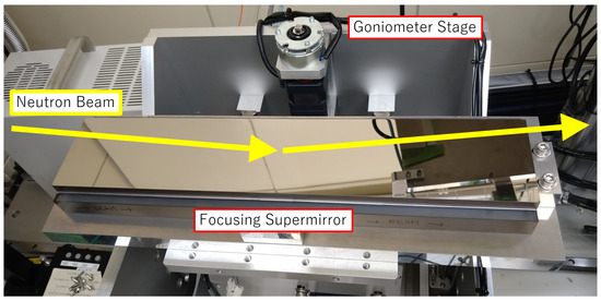 We determined the background level of the profile as counts/s, where the profile becomes significantly diffusive, and found the peak’s signal-to-background ratio (S/B ratio) to be 500. The S/B ratio did not significantly improve compared to the collimated spot, as we can see in Figure 5b,d. This result could have arisen from background growth due to off-specular scattering at the supermirror film of the focusing mirror or scattering in the quartz substrate, which must have received the broad and intense neutron beam. We may reduce the latter background and augment the focused spot’s S/B ratio by eliminating neutrons that do not impinge upon the supermirror film but directly hit the substrate with neutron-absorbing materials.