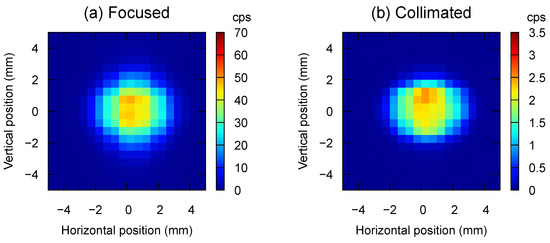 The focused beam and the collimated beam were observed at 18,000 mm from the source using a two-dimensional, multiwire-type proportional counter (MWPC) whose pixel size is 0.5 mm × 0.5 mm, spatial resolution 1.8 mm, and sensitive area 128 mm × 128 mm [33,34].