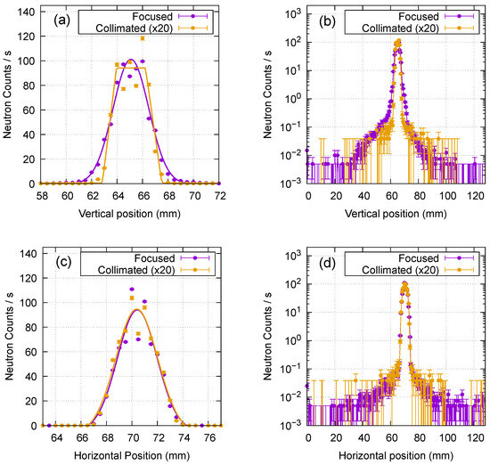 Intensity profiles cut out at the center of the focused and collimated spots of Figure 4. The collimated beam intensity was multiplied by 20. (a) Vertical profiles on a linear scale with fitted functions. (b) Vertical profiles on a log scale. (c) Horizontal profiles on a linear scale with fitted functions. (d) Horizontal profiles on a log scale. It should be noted that the neutron beam was focused only in the vertical direction.