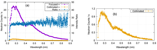 The relative intensity of the focused beam to the collimated one can be estimated using Equation (A1) in Appendix A. For the focusing beam, is given by the aperture of Slit 1 and by the acceptance of the focusing mirror (, ). is the distance from Slit 1 to the focusing mirror (). Then, the intensity is estimated as . On the other hand, for the collimated beam, both and are determined with Slit 1 and Slit 2, respectively (, ) and corresponds to the distance between the two slits (). Hence, the collimated intensity results in . Consequently, the intensity gain by the focusing is estimated to be 25.6. Assuming the neutron reflectivity of the supermirror to be 0.8, we reproduce the measured gain ≳20. This result confirms that the focusing optics work as designed. The difference in brightness between the upper and central parts of the J-PARC coupled moderator may also have boosted the intensity gain.