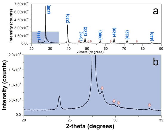 The arrows indicate evidence of secondary phases associated with small Pb- and Te-oxide peaks, as shown in Figure 1a,b. For instance, Figure 1b reveals a multiphase structure in the angular region of 27.5° ≤ 2θ ≤ 31.0°. This structure includes peaks from the α-PbO, β-PbO, and Pb3O4 phases, as well as the PbTe contribution, which is consistent with data reported in the literature [,]. Furthermore, within the angular region of 27.5° ≤ 2θ ≤ 31.0°, evidence of the α-TeO2 and PbTeO3 phases, associated with small peaks, has been found [,]. As Figure 1b shows, these phases overlap in the mentioned angular region. Additionally, small peaks associated with the referred phases appear at 2θ values of approximately 33.7°, 45.6°, 46.6°, 50.5°, 51.9°, 62.6°, and 76.6°. This fact unequivocally establishes that the precursor to be used during EBI is a multiphase mixture.