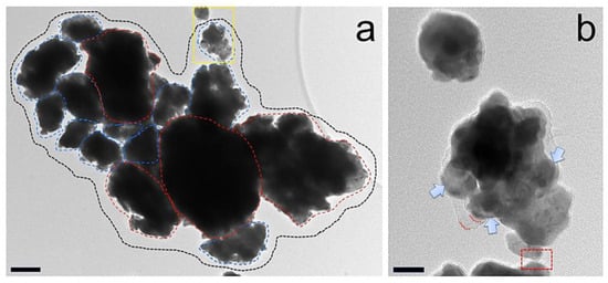 (a) Typical low-resolution TEM image of a larger micrometer-sized aggregate in the multiphase mixture after 1 h of processing time (black dashed line); it is constituted by submicrometer-sized agglomerates (blue dashed line), which reach 1 μm in size (red dashed line). Scale bar: 200 nm. (b) Magnified image of the framed zone (yellow dashed line) in (a), the arrows reveal the presence of embedded nanoparticles. Scale bar: 50 nm.