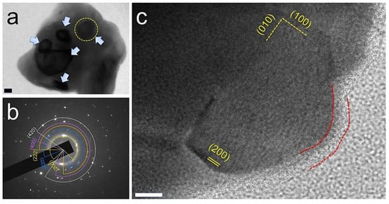 Figure 2b is a magnified TEM image of the yellow dashed zone in Figure 2a. It is a typical TEM image of smaller submicrometer-sized clusters. This figure reveals that particles tend to agglomerate, forming clusters through the coalescence of smaller particles. In the upper part of Figure 2b, a single cluster covered by an amorphous thin layer is shown, while in the middle part of the same figure, the occurrence of embedded nanoparticles as well as an amorphous layer about 20 nm in size is revealed. As indicated by the arrows in Figure 2b, these nano-sized particles have a rounded appearance. As shown by the framed zone (red dashed line) in Figure 2b, during milling, different nanostructures were brought into intimate contact via an amorphous layer as long as 6 nm. Such amorphous layers can be attributed to the deposition of vapor phases induced during milling []. In this case, however, it could correspond to the carbon applied to prevent charging.