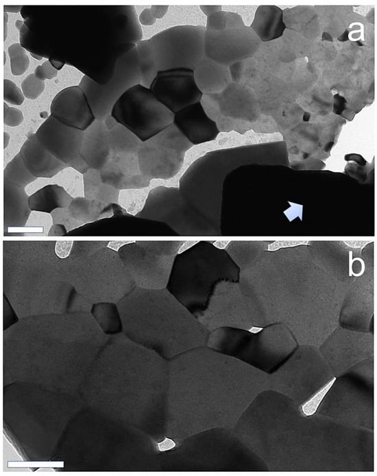 Figure 4 clearly shows the fragmentation of the multiphase mixture after EBI. Interestingly, as shown in Figure 4a, when the initial multiphase mixture, constituted by powdered aggregate microparticles, was exposed to EBI, it gave way to several rounded and faceted grains with a sintered appearance, which formed extremely quickly. It has been reported that the particle formation via EBI is influenced by local temperature, and it is affected by the distance from the irradiation point [,]. The EDS analysis of the material, indicated by the arrow in Figure 4a, revealed that it contains only lead (Pb) and oxygen (O). A comparative analysis shows that the typical grain size of the multiphase mixture after EBI lies within the range of ~30 to ~170 nm; see Figure 4a,b. As reported in the literature, in the process of spark plasma sintering, the size of the grains in a nanostructured material is correlated with their dispersion []. Therefore, it is inferred that the smaller powder dispersion in the multiphase mixture, after EBI, leads to smaller grains in the resulting nanostructured material due to the local temperature distribution during EBI [,]. Consequently, the regions far apart from the faceted grains showed only tiny particles. Furthermore, Figure 4b shows that secondary recrystallization occurs with intensive growth of larger faceted grains at the expense of smaller ones. As grain size increases during grain growth, it is expected that the driving force will decrease, as will the curvature of the grain boundary []. Consequently, the irradiated sample in the analyzed area is expected to have a higher relative density due to a reduction in void space between grains; see Figure 4b.
