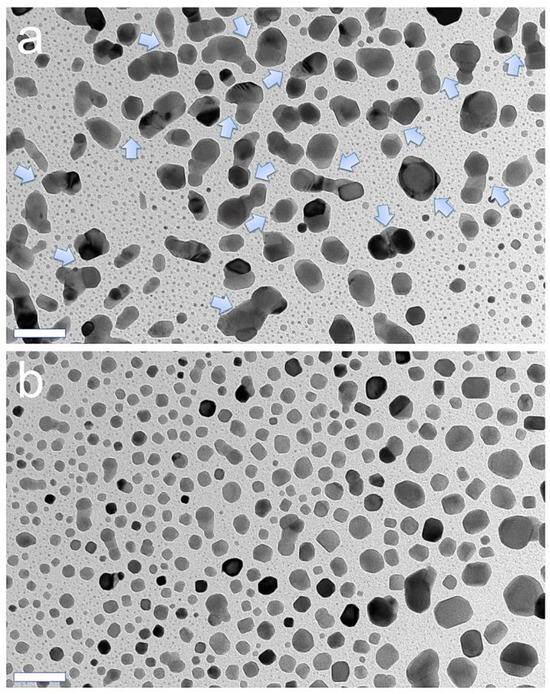 As shown in Figure 5b, it was clearly observed that the as-formed interconnected particles tended to decrease in size in regions far apart from the primary aggregate []. Moreover, the process was accompanied by the formation of spherical nanoparticles that tended to be pseudocubic after EB exposure. Therefore, it is believed that the spherical nanoparticles may have facilitated the growth of faceted PbTe NCs; see Figure 5b. It is important to keep in mind that, due to the preference for cubic morphologies in surface energy minimization, it can be challenging to achieve large spherical PbTe nanoparticles when their sizes surpass 10 nm []. Consequently, as shown in Figure 5b, the coexistence of quantum dots, pseudocubic, rounded and perfect faceted nanoparticles are demonstrated. For the sake of clarity, all these particles are depicted separately in Figure 6.