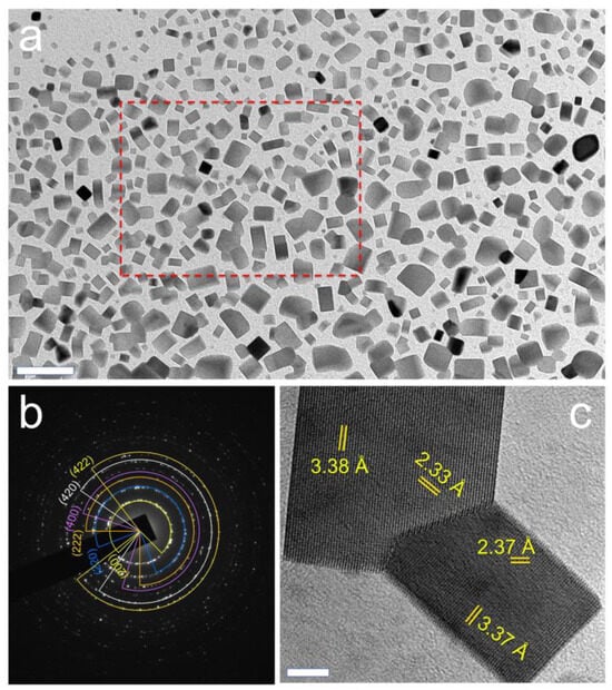 (a) TEM image of the as-formed PbTe nanoparticles after electron beam irradiation. Scale bar: 100 nm. (b) Selected area electron diffraction pattern recorded on the framed area (red dashed line) in the nanostructure shown in (a). (c) HRTEM image of faceted PbTe nanostructures along the [100] zone axis. Scale bar: 5 nm.