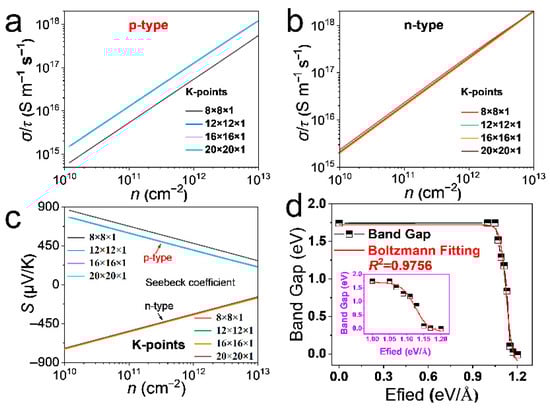 Figure 11), electric fields induce gradual band gap narrowing and orbital hybridization changes. These modifications enhance the Seebeck coefficient through stronger energy filtering while simultaneously optimizing electrical conductivity via tailored carrier transport—two key factors that drive the power factor upward. However, the reason for the effective improvement in the