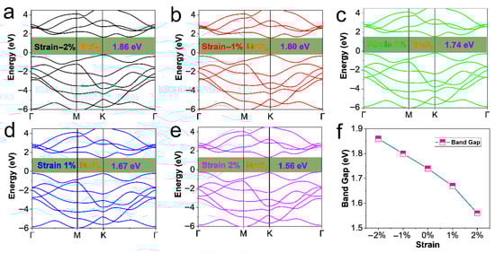 2 exhibits an indirect band gap with a value of 1.74 eV, consistent with the intrinsic electronic structure characteristics reported in previous studies. As the electric field strength rises (