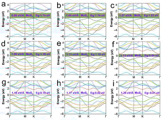 Figure 10 investigates the impact of c-axis electric fields on the band structures of MoS